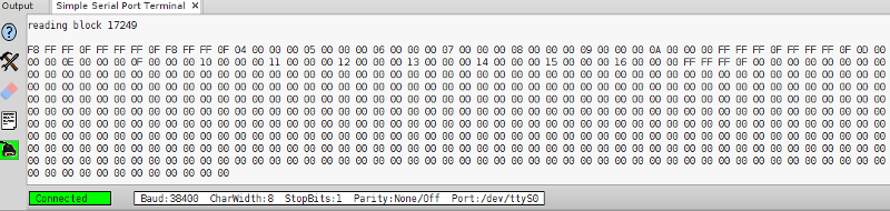 Provede se to, že se do proměnné data načte požadovaný sektor a poté se jednotlivé byty v šestnáctkovém zápise na 10 řádcích po 50 bytech plus poslední řádek 12 bytů odešlou po seriové lince. Zápis bytů si případně přeuspořádáme následně tak, aby pro nás byl přehledný.