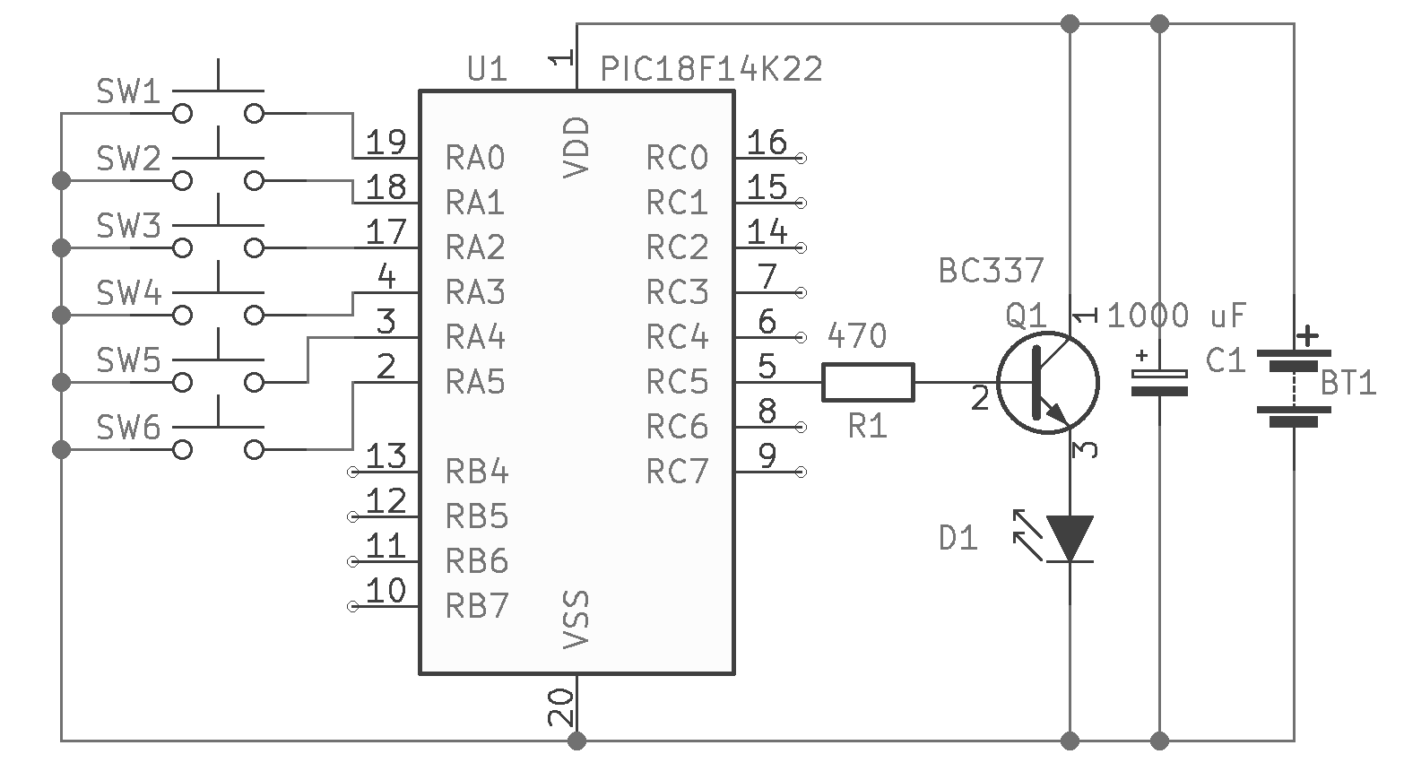 Všech šest pinů portu A má funkci "Interrupt On Change" neboli vyvolání přerušení při změně napěťové úrovně na některém z pinů. Pro využití této funkce je třeba nastavit piny jako vstupní (registr TRISA) a povolit funkci pro každý pin (registr IOCA). Taktéž využiju interní pull-up funkci (registr WPUA a bit RABPU v registru INTCON2) - piny budou registrovat úroveň 1 bez nutnosti použít externí rezistory.