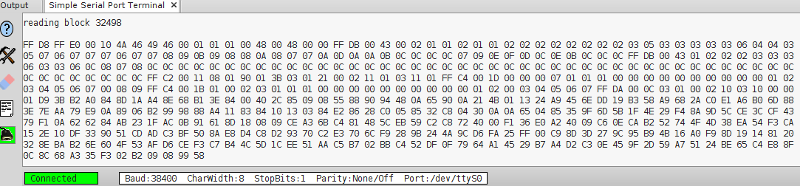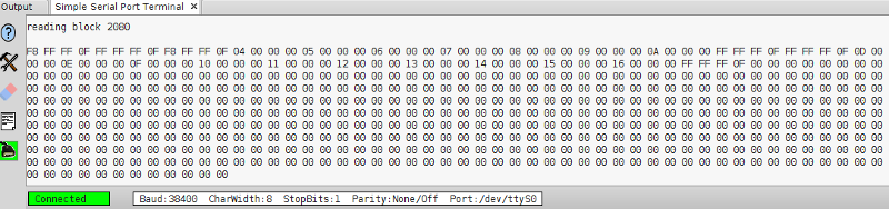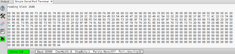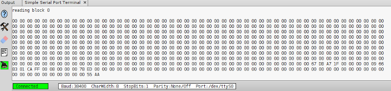 Provede se to, že se do proměnné data načte požadovaný sektor a poté se jednotlivé byty v šestnáctkovém zápise na 10 řádcích po 50 bytech plus poslední řádek 12 bytů odešlou po seriové lince. Zápis bytů si případně přeuspořádáme následně tak, aby pro nás byl přehledný.