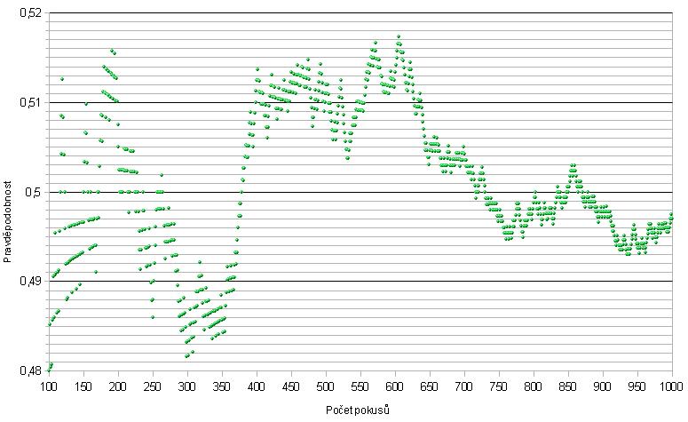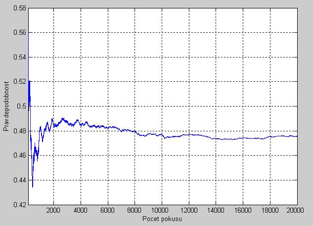 Výsledná četnost z pokusu vychází 49.7 %. Výpočet podle vzorce dává hodnotu pravděpodobnosti 47.75 %.