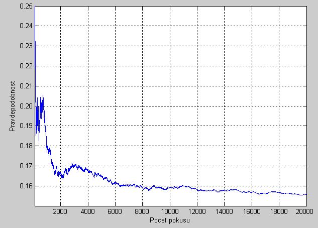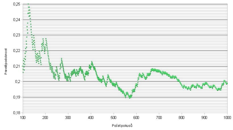 Výsledná četnost z pokusu vychází 19.9 %. Výpočet podle vzorce dává hodnotu pravděpodobnosti 15.92 %.