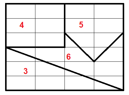 Maminka dělí čokoládu, která má 6x4 shodných dílkù, svým čtyřem dětem. Jak může maminka rozdělit čokoládu na právě čtyři části se stejným obsahem tak, aby jeden útvar byl trojúhelník, jeden čtyřúhelník, jeden pětiúhelník a jeden šestiúhelník?