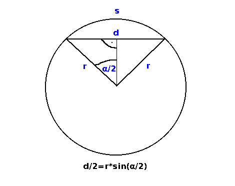 3) Jakmile budeme znát velikost úhlu, vzdálenost mezi body po povrchu $s$ se spočítá ze vztahu