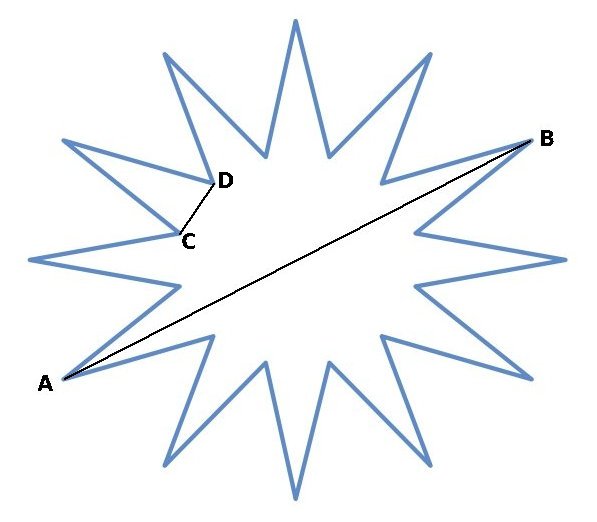 Na obrázku dole je znázorněna $12$ti cípá hvězda. Tato hvězda je osově souměrná podle každé přímky, která prochází dvěma protilehlými vrcholy. Na obrázku jsou označeny dva z těchto protilehlých vrcholů $A$ a $B$.